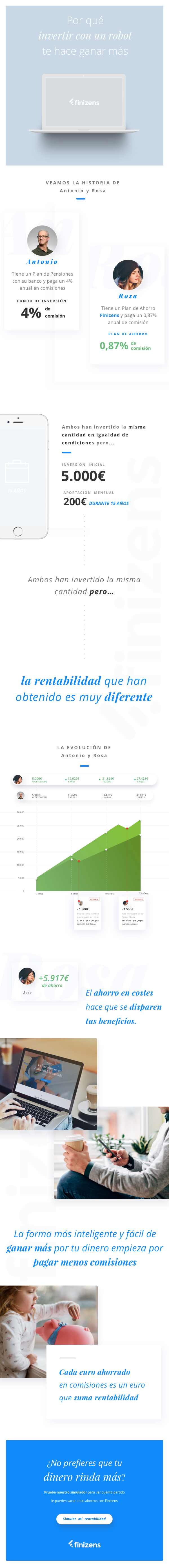 En Finizens la gestión de tus ahorros corre enteramente a cargo de nuestra plataforma tecnológica y algoritmos financieros, esto es nuestro ‘robot’. Al estar todo automatizado conseguimos abaratar los costes de gestión y ofrecerte una cartera de fondos de inversión hasta un 85% más barata que las ofertadas por los bancos (según datos de Morningstar Direct).